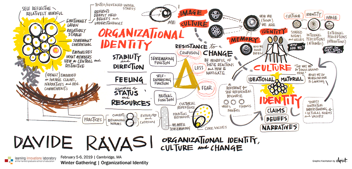 But how are organizational identities created? Davide laid out some basics of organizational identity formation. Who we are (identity) comes from interactions among who others say we are (image), the way we do things (culture), and who we have been (memory).